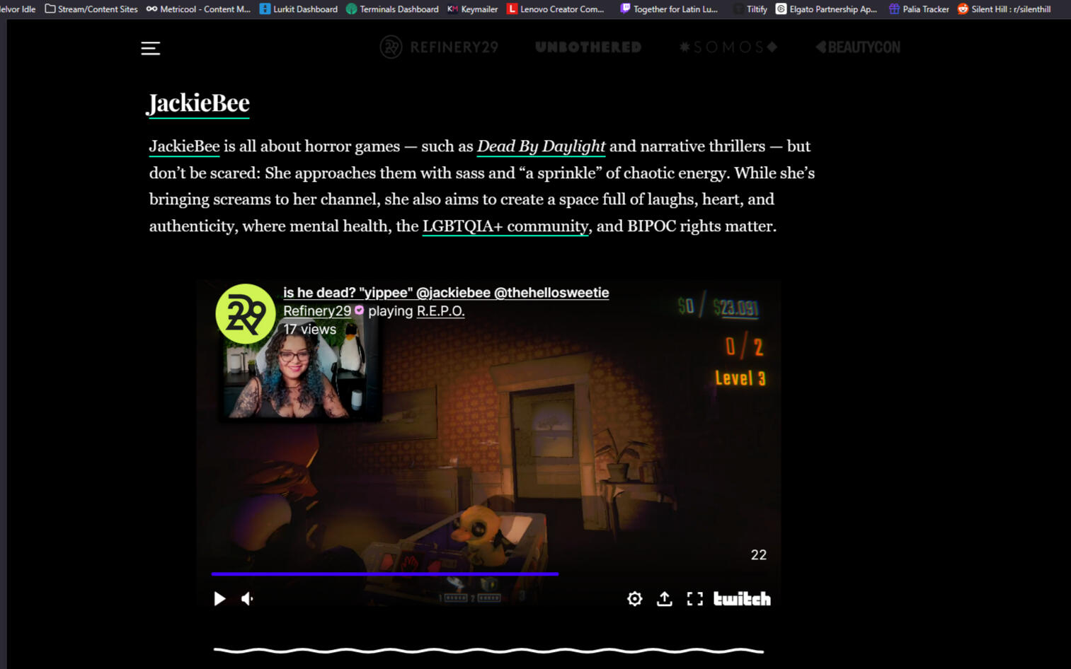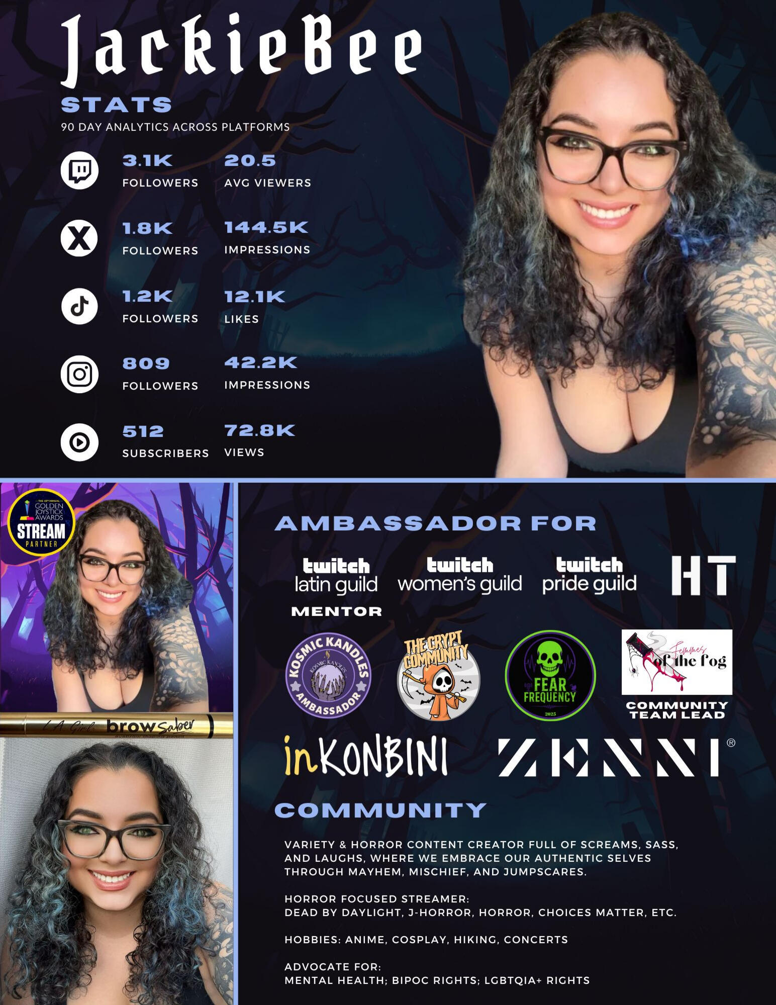 A bisexual, Latina horror & variety content creator, cosplayer, and scream queen, who is full of scares, screams, & sass, while embracing authenticity through the spirited mayhem. If you’re ever lost, follow the screams and laughs.